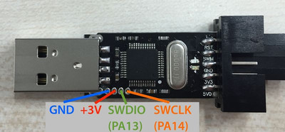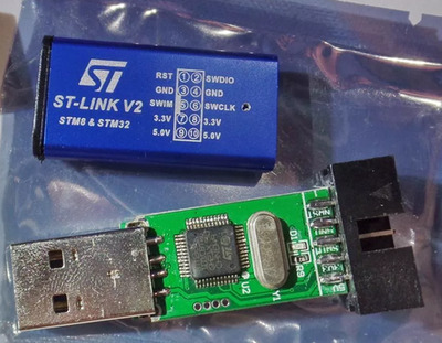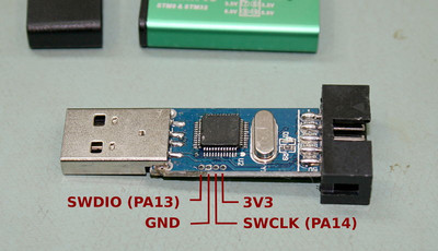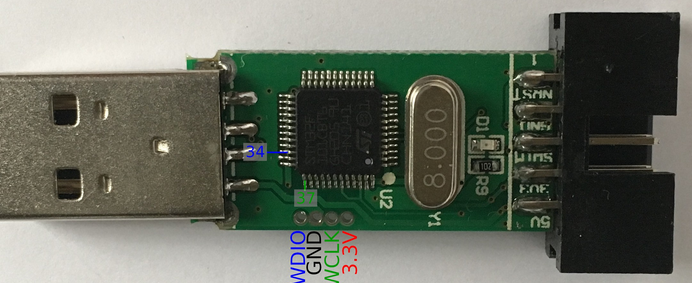 Для изготовления этого варианта эмулятора нужно иметь опыт пайки. Если его нет, следует использовать модуль Blue Pill. Отладчик ST-Link основан на микроконтроллере STM32F103C8T6, а значит он подходит для эмулятора клавиатуры и мышки. Все что нужно это перепрошить отладчик. Для этого его необходимо разобрать сдвинув корпус в сторону USB разъема. Отладчик в разобранном виде. На фото ниже микроконтроллера видны 4 отверстия. Это выводы интерфейса SWD через который его нужно прошить этой прошивкой. Как это сделать написано здесь. Существует много вариантов разводки платы отладчика и распиновка этих выводов отличается. Вот два варианта найденных в сети. Кроме этих существуют другие разводки платы. Например не с отверстиями, а с контактными площадками. Необходимо мультиметром в режиме прозвонки найти контакты питания 3.3v и GND а также выводы SWDIO и SWCLK которые связанны с выводами 34 и 37 микроконтроллера. | |