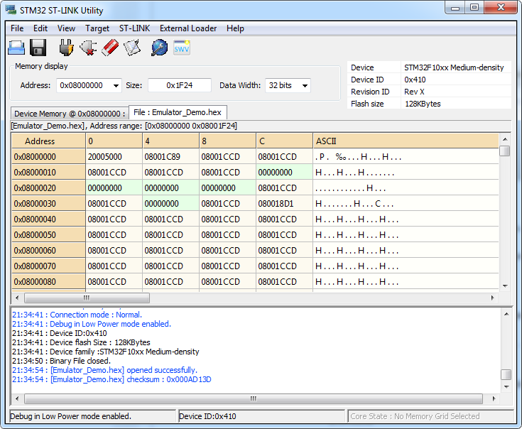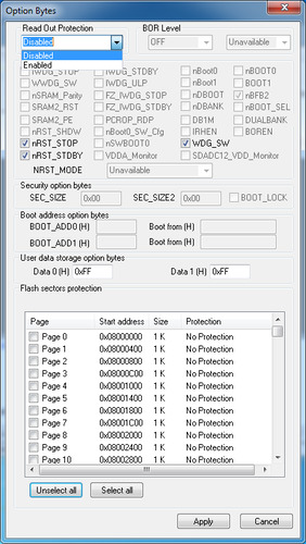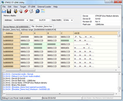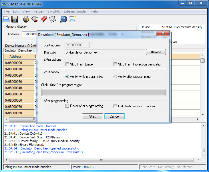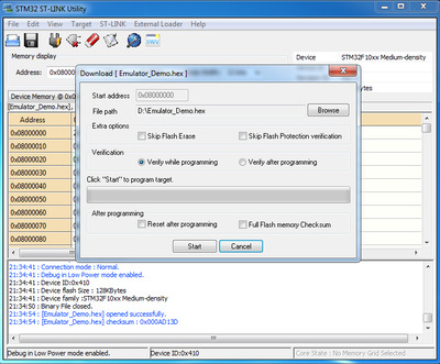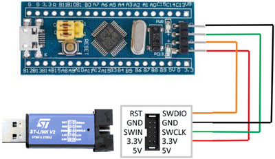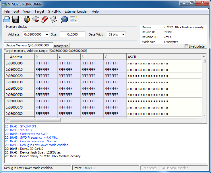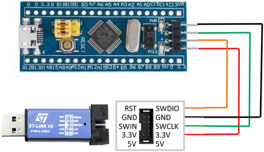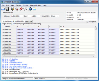 Чтобы прошить микроконтроллер STM32 через интерфейс SWD потребуется отладчик ST-Link. Его можно купить в интернет магазинах eBay, AliExpress и других или в магазине радиодеталей. Стоимость от 120 рублей. Выглядит он так. С одной стороны у него USB разъем для подключения к компьютеру, а в другой ряд контактов предназначенных для соединения с микроконтроллером STM32. Назначение контактов указано на корпусе. Чтобы прошить модуль Blue Pill нужно подключить отладчик и модуль четырьмя проводами (они находятся в антистатическом пакете вместе с ST-Link) как показано на картинке. Бывают ST-Link с другим расположением контактов. Это нужно учитывать при соединении отладчика и модуля. Далее нужно скачать с официального сайта STMicroelectronics приложение ST-LINK Utility. Для этого потребуется указать адрес почты на который отправят ссылку для скачивания. Или можете скачать с этого сайта. Из-за ограничений размера файла, архив разделен на две части - 1 и 2. Скачайте в одну папку и откройте в архиваторе поддерживающим многотомные zip архивы. Установка выполняется также как у других приложений и после ее завершения на рабочем столе появится ярлык приложения STM32 ST-LINK Utility. Запускаем и перед нами появится окно Теперь нужно подключить отладчик ST-Link к USB порту компьютера и в окне нажать кнопку "Connect to the target". Если все сделано правильно (отладчик подключен к модулю согласно схеме выше) и не произошло ошибок, в окне появится информация об микроконтроллере и содержимом flash памяти. Чтобы залить прошивку нужно открыть hex-файл кликнув по кнопке Open file и указав место его расположения на диске. В окне отобразится содержимое файла, а в логе появится сообщение об открытии файла. Теперь нужно нажать на кнопку Program verify. Это откроет окно прошивки в котором необходимо нажать на кнопку Start чтобы залить прошивку в модуль. Прошивка залита и можно закрыть приложение и отключить ST-Link от USB порта компьютера и от модуля Blue Pill. На этапе подключения могут появиться ошибки. Рассмотрим некоторые их них. Если не подключен отладчик или по какой-то причине приложение не может его обнаружить, появится это сообщение об ошибке. Если по той или иной причине недоступен интерфейс SWD из-за чего отладчик не сможет подключится к микроконтроллеру, появится эта ошибка. Следует проверить правильно ли подключен отладчик к модулю (возможно перепутаны провода) и надежность соединения (наличие контакта). Если подключено верно, возможно прошивка в микроконтроллере отключила SWD интерфейс или другим образом препятствует его работе (например используются энергосберегающие функции). Решение довольно простое. Необходимо перемычку BOOT0 находящуюся на плате модуля переместить из позиции 0, в позицию 1, что не даст возможности выполняться прошивке. Это необходимо сделать при отключенном от компьютера отладчике ST-Link и модуле Blue Pill. После прошивки эту перемычку нужно вернуть обратно в позицию 0, иначе прошивка работать не будет. Еще одна причина ошибки не позволяющая перевести микроконтроллер в режим программирования - защита прошивки от чтения. Иногда такое бывает модулях купленных в Китае. Чтобы отключить защиту от чтения, необходимо в меню Target открыть окно Option Bytes. Чтобы отключить защиту в выпадающем списке Read Out Protection следует выбрать Disabled. Также нужно убедится что в списке Flash sectors protection отсутствуют галочки. После нажатия кнопки Apply защита будет сня
